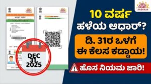 🚨 ಆಧಾರ್ ಬಿಗ್ ಅಪ್ಡೇಟ್: ನಿಮ್ಮ ಆಧಾರ್ ಕಾರ್ಡ್ ಪಡೆದು 10 ವರ್ಷ ಕಳೆದಿದ್ದರೆ ಕೂಡಲೇ ದಾಖಲೆಗಳನ್ನು ಅಪ್ಡೇಟ್ ಮಾಡುವುದು ಕಡ್ಡಾಯ. ಜನವರಿ 1 ರಿಂದ ಆಧಾರ್ನ ಹೊಸ ವಿನ್ಯಾಸ ಜಾರಿಗೆ ಬರುತ್ತಿದ್ದು, ಇನ್ಮುಂದೆ ಗುರುತಿಗಾಗಿ ಆಧಾರ್ ಜೆರಾಕ್ಸ್ ನೀಡುವ ಅಗತ್ಯವಿರುವುದಿಲ್ಲ. ಬದಲಾಗಿ ಡಿಜಿಟಲ್ ಕ್ಯೂಆರ್ ಕೋಡ್ ಸ್ಕ್ಯಾನಿಂಗ್ಗೆ ಆದ್ಯತೆ ನೀಡಲಾಗುತ್ತದೆ. ಬ್ಯಾಂಕ್ ಕೆಲಸ ಇರಲಿ ಅಥವಾ ಪಡಿತರ ಚೀಟಿ ಪಡೆಯುವುದಿರಲಿ, ಪ್ರತಿಯೊಂದಕ್ಕೂ ಆಧಾರ್ ಕಾರ್ಡ್ ಅನಿವಾರ್ಯ. ಆದರೆ, ನಿಮ್ಮ ಆಧಾರ್ ಕಾರ್ಡ್ ಹಳೆಯದಾಗಿದ್ದರೆ ಅಥವಾ ನೀವು … Continue reading ಆಧಾರ್ ಕಾರ್ಡ್ನಲ್ಲಿ ಮಹತ್ವದ ಬದಲಾವಣೆ: ಡಿ.31ರೊಳಗೆ ತಪ್ಪದೇ ಈ ಕೆಲಸ ಮಾಡಿ ಜ.1 ರಿಂದ ಹೊಸ ನಿಯಮ ಜಾರಿ.!