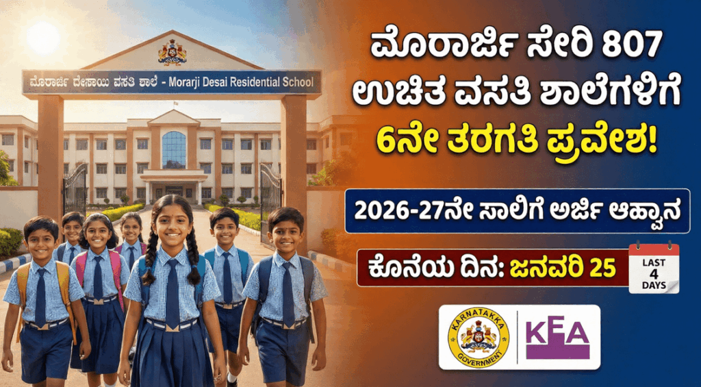 📢 ಮುಖ್ಯ ಮುಖ್ಯಾಂಶಗಳು 807 ಉಚಿತ ವಸತಿ ಶಾಲೆಗಳ ಪ್ರವೇಶಕ್ಕೆ ಅರ್ಜಿ ಆಹ್ವಾನ. ಅರ್ಜಿ ಸಲ್ಲಿಸಲು ಜನವರಿ 25 ಕೊನೆಯ ದಿನಾಂಕವಾಗಿದೆ. ಮಾರ್ಚ್ 1 ರಂದು ರಾಜ್ಯಾದ್ಯಂತ ಪ್ರವೇಶ ಪರೀಕ್ಷೆ ನಡೆಯಲಿದೆ. ಬೆಂಗಳೂರು: ಗ್ರಾಮೀಣ ಭಾಗದ ಪ್ರತಿಭಾವಂತ ಮಕ್ಕಳಿಗೆ ಹಾಗೂ ಆರ್ಥಿಕವಾಗಿ ಹಿಂದುಳಿದ ಕುಟುಂಬಗಳ ವಿದ್ಯಾರ್ಥಿಗಳಿಗೆ ಗುಣಮಟ್ಟದ ಶಿಕ್ಷಣ ನೀಡಲು ಕರ್ನಾಟಕ ಸರ್ಕಾರವು ನಡೆಸುತ್ತಿರುವ ವಸತಿ ಶಾಲೆಗಳಲ್ಲಿ 2026-27ನೇ ಶೈಕ್ಷಣಿಕ ಸಾಲಿನ ದಾಖಲಾತಿ ಪ್ರಕ್ರಿಯೆ ಆರಂಭವಾಗಿದೆ. ಮೊರಾರ್ಜಿ ದೇಸಾಯಿ ಸೇರಿದಂತೆ ವಿವಿಧ ಉಚಿತ ವಸತಿ ಶಾಲೆಗಳ 6ನೇ … Continue reading ಮೊರಾರ್ಜಿ ದೇಸಾಯಿ ಸೇರಿದಂತೆ 807 ವಸತಿ ಶಾಲೆಗಳಲ್ಲಿ 6ನೇ ತರಗತಿ ಪ್ರವೇಶಕ್ಕೆ ಅರ್ಜಿ ಆರಂಭ: ಅರ್ಜಿ ಸಲ್ಲಿಕೆಯ ಸಂಪೂರ್ಣ ಮಾಹಿತಿ!