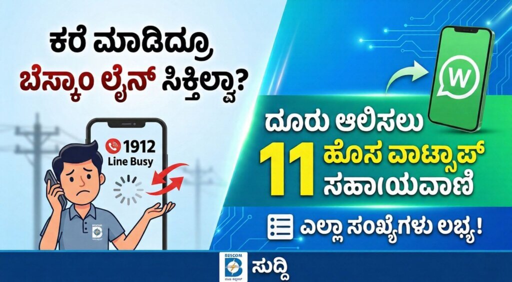 ಮುಖ್ಯಾಂಶಗಳು (Highlights) 1912 ಫೋನ್ ಲೈನ್ ಸಿಗದಿದ್ದರೆ ಪರ್ಯಾಯ ವ್ಯವಸ್ಥೆ. 8 ಜಿಲ್ಲೆಗಳಿಗೆ 11 ಹೊಸ ವಾಟ್ಸಾಪ್ ಸಹಾಯವಾಣಿ. ದೂರಿನ ಜೊತೆ ಫೋಟೋ, ವಿಡಿಯೋ ಕಳುಹಿಸಲು ಅವಕಾಶ. ಬೆಂಗಳೂರು ಸೇರಿದಂತೆ ಬೆಸ್ಕಾಂ ವ್ಯಾಪ್ತಿಯ ಜಿಲ್ಲೆಗಳಲ್ಲಿ ವಿದ್ಯುತ್ ಸಮಸ್ಯೆ ಎದುರಾದಾಗ ಅಥವಾ ಲೈನ್ ಕಟ್ ಆದಾಗ ಸಹಾಯವಾಣಿಗೆ ಕರೆ ಮಾಡುವುದು ಸಾಮಾನ್ಯ. ಆದರೆ, ಬೆಸ್ಕಾಂನ ಅಧಿಕೃತ ಸಹಾಯವಾಣಿ ಸಂಖ್ಯೆ 1912 ಕ್ಕೆ ಕರೆ ಮಾಡಿದರೆ ಹಲವು ಬಾರಿ ಸಂಪರ್ಕ ಸಿಗುತ್ತಿಲ್ಲ ಎಂಬ ದೂರುಗಳು ಗ್ರಾಹಕರಿಂದ ಕೇಳಿಬರುತ್ತಿದ್ದವು. ಈ ಸಮಸ್ಯೆಗೆ … Continue reading ಬೆಸ್ಕಾಂ ನವರಿಗೆ ಫೋನ್ ಮಾಡಿದ್ರೂ ಲೈನ್ ಸಿಗ್ತಿಲ್ವಾ? ಗ್ರಾಹಕರ ಕಂಪ್ಲೆಂಟ್ ಆಲಿಸಲು 11 ಹೊಸ ಸಹಾವಾಣಿಗಳ ಸಂಖ್ಯೆ ಬಿಡುಗಡೆ.!