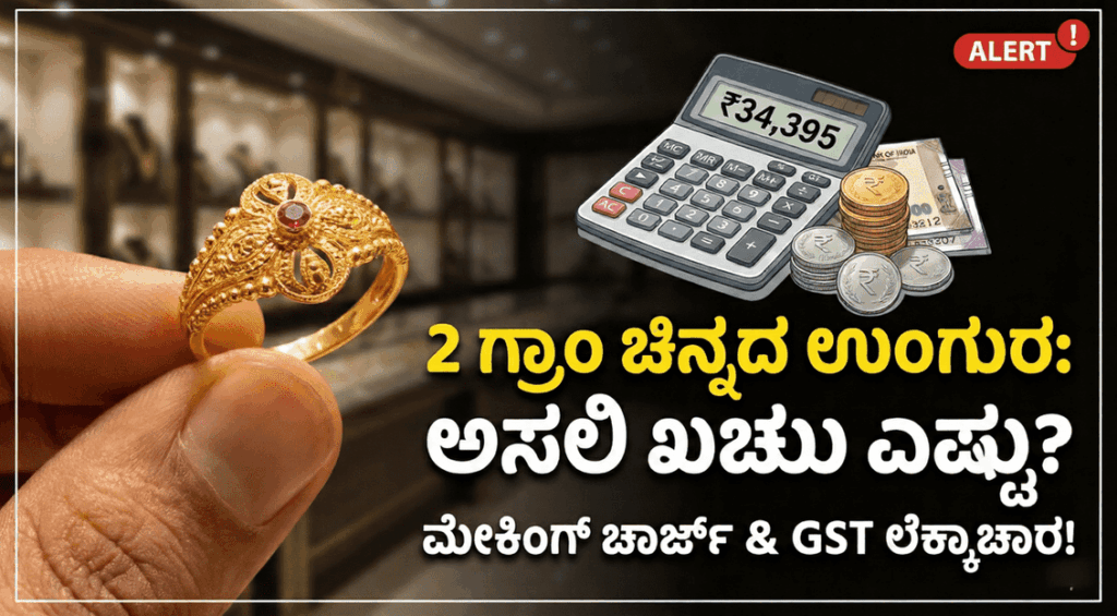 ಮುಖ್ಯಾಂಶಗಳು (Highlights) 2 ಗ್ರಾಂ ಉಂಗುರ ದಿನನಿತ್ಯ ಬಳಕೆಗೆ ಹೆಚ್ಚು ಗಟ್ಟಿಮುಟ್ಟು. ಚಿನ್ನದ ಬೆಲೆಗೆ 15% ಮೇಕಿಂಗ್ ಚಾರ್ಜ್ ಅನ್ವಯವಾಗುತ್ತದೆ. ಒಟ್ಟು ಬಿಲ್ ಮೇಲೆ ಕಡ್ಡಾಯವಾಗಿ 3% GST ಪಾವತಿಸಬೇಕು. ಮನೆಮಂದಿಗೆ ಅಥವಾ ನಿಮಗಾಗಿಯೇ ಒಂದು ಪುಟ್ಟ ಉಂಗುರ ಮಾಡಿಸೋಣ ಅಂತ ಪ್ಲಾನ್ ಮಾಡ್ತಿದ್ದೀರಾ? ಬಜೆಟ್ ಕಡಿಮೆ ಇದೆ ಅಂತ 1 ಗ್ರಾಂ ಉಂಗುರ ಮಾಡಿಸಿದ್ರೆ ಅದು ಬೇಗ ಬೆಂಡ್ ಆಗುತ್ತೆ ಅಥವಾ ಮುರಿದು ಹೋಗೋ ಭಯ ಇರುತ್ತೆ. ಅದಕ್ಕೆ ಸ್ವಲ್ಪ ದುಡ್ಡು ಜಾಸ್ತಿ ಆದ್ರೂ ಪರವಾಗಿಲ್ಲ, … Continue reading 2 ಗ್ರಾಂ ಚಿನ್ನದ ಉಂಗುರ ಮಾಡಿಸೋಕೆ ಅಸಲಿ ಖರ್ಚು ಎಷ್ಟಾಗುತ್ತೆ ಗೊತ್ತಾ? ಇಲ್ಲಿದೆ ಕಂಪ್ಲೀಟ್ ಲೆಕ್ಕಾಚಾರ!