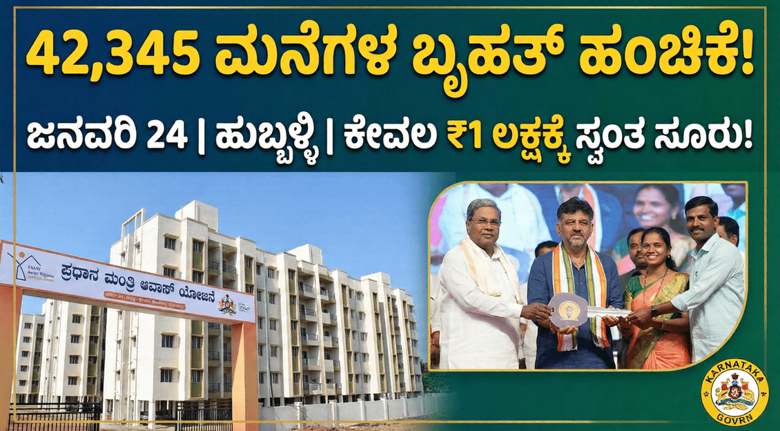ಹುಬ್ಬಳ್ಳಿ: ಕರ್ನಾಟಕದ ವಸತಿ ರಹಿತರ ಪಾಲಿಗೆ ಹೊಸ ವರ್ಷದ ಆರಂಭದಲ್ಲಿಯೇ ರಾಜ್ಯ ಸರ್ಕಾರ ಸಿಹಿ ಸುದ್ದಿಯೊಂದನ್ನು ನೀಡಿದೆ. ಪ್ರಧಾನ ಮಂತ್ರಿ ಆವಾಸ್ ಯೋಜನೆ (PMAY) ಅಡಿಯಲ್ಲಿ ನಿರ್ಮಾಣಗೊಂಡಿರುವ ಸುಮಾರು 42,345 ಮನೆಗಳ ಬೃಹತ್ ಹಂಚಿಕೆ ಪ್ರಕ್ರಿಯೆಗೆ ದಿನಾಂಕ ನಿಗದಿಯಾಗಿದೆ. ಜನವರಿ 24, 2026 ರಂದು ಹುಬ್ಬಳ್ಳಿಯಲ್ಲಿ ನಡೆಯಲಿರುವ ಐತಿಹಾಸಿಕ ಕಾರ್ಯಕ್ರಮದಲ್ಲಿ ಸಾವಿರಾರು ಕುಟುಂಬಗಳಿಗೆ ಸ್ವಂತ ಮನೆಯ ಹಕ್ಕುಪತ್ರಗಳನ್ನು ವಿತರಿಸಲಾಗುವುದು.