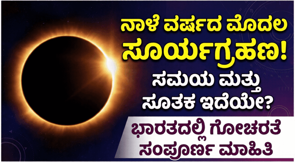 ಮುಖ್ಯಾಂಶಗಳು (Highlights) ⚡ ನಾಳೆ ಸಂಜೆ 5:26ಕ್ಕೆ ಅಪರೂಪದ ‘ಬೆಂಕಿಯ ಉಂಗುರ’ ಸೂರ್ಯಗ್ರಹಣ ಆರಂಭ. ⚡ ಭಾರತದಲ್ಲಿ ಗ್ರಹಣ ಕಾಣಿಸದ ಕಾರಣ ಯಾವುದೇ ಸೂತಕ ಇರುವುದಿಲ್ಲ. ⚡ ಎಂದಿನಂತೆ ಪೂಜೆ ಮತ್ತು ದೈನಂದಿನ ಕೆಲಸಗಳನ್ನು ನೀವು ಮಾಡಬಹುದು. ಖಗೋಳ ಆಸಕ್ತರಿಗೆ ಮತ್ತು ಜ್ಯೋತಿಷ್ಯ ಶಾಸ್ತ್ರವನ್ನು ನಂಬುವವರಿಗೆ ಒಂದು ಪ್ರಮುಖ ಸುದ್ದಿ ಇಲ್ಲಿದೆ. 2026ರ ವರ್ಷದ ಪ್ರಥಮ ಸೂರ್ಯಗ್ರಹಣವು ನಾಳೆ, ಅಂದರೆ February 17, 2026 ರಂದು ಸಂಭವಿಸಲಿದೆ. ಈ ಬಾರಿಯ ಗ್ರಹಣವು ಅತ್ಯಂತ ವಿಶೇಷವಾಗಿದ್ದು, ಆಕಾಶದಲ್ಲಿ ಸೂರ್ಯನು … Continue reading ನಾಳೆ 2026ರ ಮೊದಲ ಸೂರ್ಯಗ್ರಹಣ: ಆಕಾಶದಲ್ಲಿ ‘ಬೆಂಕಿಯ ಉಂಗುರ’ ದರ್ಶನ! ಸಮಯ ಮತ್ತು ಸೂತಕದ ಮಾಹಿತಿ ಇಲ್ಲಿದೆ