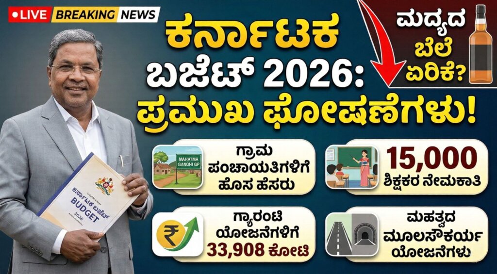 ಬಜೆಟ್ ಮುಖ್ಯಾಂಶಗಳು (Highlights) ಎಲ್ಲಾ ಗ್ರಾಮ ಪಂಚಾಯಿತಿಗಳಿಗೆ ‘ಮಹಾತ್ಮ ಗಾಂಧಿ’ ಎಂದು ಮರುನಾಮಕರಣ. ಗೃಹಲಕ್ಷ್ಮಿ ಯೋಜನೆಗೆ ₹28,608 ಕೋಟಿ ಭಾರಿ ಅನುದಾನ ಮೀಸಲು. ರಾಜ್ಯದ ವಿವಿಧ ಇಲಾಖೆಗಳಲ್ಲಿ 56,432 ಸರ್ಕಾರಿ ಹುದ್ದೆಗಳ ಭರ್ತಿ. ಬೆಂಗಳೂರು: ಮುಖ್ಯಮಂತ್ರಿ ಸಿದ್ದರಾಮಯ್ಯ ಅವರು 2026-27ನೇ ಸಾಲಿನ ರಾಜ್ಯ ಬಜೆಟ್ ಅನ್ನು ವಿಧಾನಸೌಧದಲ್ಲಿ ಮಂಡಿಸಿದರು. ಬಜೆಟ್ ಮಂಡನೆಗೂ ಮುನ್ನ ವಿಶೇಷ ಸಚಿವ ಸಂಪುಟ ಸಭೆಯಲ್ಲಿ ಅನುಮೋದನೆ ಪಡೆದ ಸಿಎಂ, ರಾಜ್ಯದ ಸಮಗ್ರ ಅಭಿವೃದ್ಧಿ ಮತ್ತು ಸಾಮಾಜಿಕ ನ್ಯಾಯದ ದೃಷ್ಟಿಯಿಂದ ಹಲವು ಮಹತ್ವದ ಯೋಜನೆಗಳನ್ನು … Continue reading ಗ್ರಾಮ ಪಂಚಾಯತಿಗಳಿಗೆ ಗಾಂಧಿ ಹೆಸರು, ಮದ್ಯದ ದರ ಏರಿಕೆ ಸುಳಿವು; ಸಿಎಂ ಸಿದ್ದರಾಮಯ್ಯ ಘೋಷಿಸಿದ ಪ್ರಮುಖ ಯೋಜನೆಗಳ ಪಟ್ಟಿ ಇಲ್ಲಿದೆ