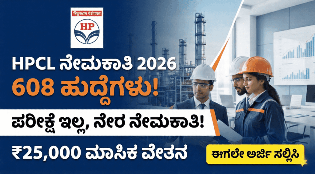 ಮುಖ್ಯಾಂಶಗಳು (Highlights): ಒಟ್ಟು 608 ಅಪ್ರೆಂಟಿಸ್ ಟ್ರೈನಿ ಹುದ್ದೆಗಳ ಭರ್ಜರಿ ನೇಮಕಾತಿ. ಪರೀಕ್ಷೆ ಅಥವಾ ಸಂದರ್ಶನವಿಲ್ಲದೆ ಅಂಕಗಳ ಆಧಾರದ ಮೇಲೆ ಆಯ್ಕೆ. ಆಯ್ಕೆಯಾದವರಿಗೆ ಪ್ರತಿ ತಿಂಗಳು ₹25,000 ಸ್ಟೈಫಂಡ್ ಲಭ್ಯ. ಬೃಹತ್ ಸಾರ್ವಜನಿಕ ವಲಯದ ಉದ್ಯಮವಾಗಿರುವ ಹಿಂದೂಸ್ತಾನ್ ಪೆಟ್ರೋಲಿಯಂ ಕಾರ್ಪೊರೇಷನ್ ಲಿಮಿಟೆಡ್ (HPCL) ಖಾಲಿ ಇರುವ ಹುದ್ದೆಗಳ ಭರ್ತಿಗೆ ಅಧಿಕೃತ ಅಧಿಸೂಚನೆ ಹೊರಡಿಸಿದೆ. ಇಂಜಿನಿಯರಿಂಗ್ ಪದವಿ ಮುಗಿಸಿ ಕೆಲಸದ ಹುಡುಕಾಟದಲ್ಲಿರುವ ಅಭ್ಯರ್ಥಿಗಳಿಗೆ ಇದು ಅದ್ಭುತ ಅವಕಾಶವಾಗಿದೆ. ವಿಶೇಷವೆಂದರೆ, ಯಾವುದೇ ಲಿಖಿತ ಪರೀಕ್ಷೆ ಅಥವಾ ಕಠಿಣ ಸಂದರ್ಶನವಿಲ್ಲದೆ ಕೇವಲ … Continue reading HPCL Recruitment 2026: ಬಿಇ, ಬಿ.ಟೆಕ್ ಪದವೀಧರರಿಗೆ ಸುವರ್ಣಾವಕಾಶ; ಪರೀಕ್ಷೆಯಿಲ್ಲದೆ HPCL ನಲ್ಲಿ ಕೆಲಸ, 25,000 ರೂ. ಸಂಬಳ!