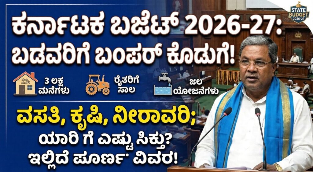 📌 ಬಜೆಟ್ ಮುಖ್ಯಾಂಶಗಳು (Highlights) ✓ 38 ಲಕ್ಷ ರೈತರಿಗೆ ₹30,000 ಕೋಟಿ ಶೂನ್ಯ ಬಡ್ಡಿ ಸಾಲ. ✓ ಈ ವರ್ಷ 3 ಲಕ್ಷ ಮನೆ ಪೂರ್ಣ, 50,000 ನಿವೇಶನ ವಿತರಣೆ. ✓ ಗಂಗಾ ಕಲ್ಯಾಣ ಯೋಜನೆಯ ಸಹಾಯಧನ ₹1.50 ಲಕ್ಷಕ್ಕೆ ಏರಿಕೆ. ಬೆಂಗಳೂರು: “ಸರ್ವರ ಸಬಲೀಕರಣ, ಅವಕಾಶಗಳ ಅನಾವರಣ ಹಾಗೂ ನವ ಕರ್ನಾಟಕದ ನಿರ್ಮಾಣ” ಎಂಬ ದೂರದೃಷ್ಟಿಯೊಂದಿಗೆ ಮುಖ್ಯಮಂತ್ರಿ ಸಿದ್ದರಾಮಯ್ಯನವರು 2026-27ನೇ ಸಾಲಿನ ರಾಜ್ಯ ಆಯವ್ಯಯವನ್ನು ಮಂಡಿಸಿದ್ದಾರೆ. ಈ ಬಜೆಟ್ನಲ್ಲಿ ಜನಸಾಮಾನ್ಯರ ನಿರೀಕ್ಷೆಯಂತೆ ವಸತಿ, ಕೃಷಿ, … Continue reading ಕರ್ನಾಟಕ ಬಜೆಟ್ 2026-27: ಸಿದ್ದರಾಮಯ್ಯ ಬಜೆಟ್ನ ಮುಖ್ಯಾಂಶಗಳು; ಯಾವ ಇಲಾಖೆಗೆ ಎಷ್ಟು ಸಿಕ್ಕಿದೆ? ಇಲ್ಲಿದೆ ಕಂಪ್ಲೀಟ್ ಡಿಟೇಲ್ಸ್