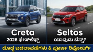 ⚡ ಮುಖ್ಯಾಂಶಗಳು (Highlights): 🚗 Creta 2026: ಫ್ಯಾಮಿಲಿ ಮತ್ತು ಆರಾಮದಾಯಕ ಪ್ರಯಾಣಕ್ಕೆ ಬೆಸ್ಟ್ ಆಯ್ಕೆ. 🚀 Seltos 2026: ವೇಗ ಮತ್ತು ಸ್ಪೋರ್ಟಿ ಲುಕ್ ಇಷ್ಟಪಡುವವರಿಗೆ ಸೂಪರ್. 🛡️ ಸುರಕ್ಷತೆ: ಎರಡರಲ್ಲೂ 6 ಏರ್ಬ್ಯಾಗ್ ಮತ್ತು ADAS ತಂತ್ರಜ್ಞಾನ ಫಿಕ್ಸ್! ಹೊಸ ಕಾರು ಖರೀದಿ ಮಾಡಬೇಕು ಅಂತ ಪ್ಲಾನ್ ಮಾಡ್ತಿದ್ದೀರಾ? ಅದರಲ್ಲೂ SUV ಅಂದ್ರೆ ನಮ್ ಕನ್ನಡಿಗರಿಗೆ ಪಂಚಪ್ರಾಣ. ಆದ್ರೆ ಮಾರ್ಕೆಟ್ನಲ್ಲಿರೋ Hyundai Creta ತಗೋಳೋದಾ ಅಥವಾ Kia Seltos ತಗೋಳೋದಾ ಅನ್ನೋ ಕನ್ಫ್ಯೂಷನ್ ನಿಮಗೂ … Continue reading Creta ಅಥವಾ Seltos: 2026 ರಲ್ಲಿ ನಿಮ್ಮ ಕುಟುಂಬಕ್ಕೆ ಯಾವುದು ಬೆಸ್ಟ್? ಇಲ್ಲಿದೆ ಪಕ್ಕಾ ರಿಪೋರ್ಟ್!