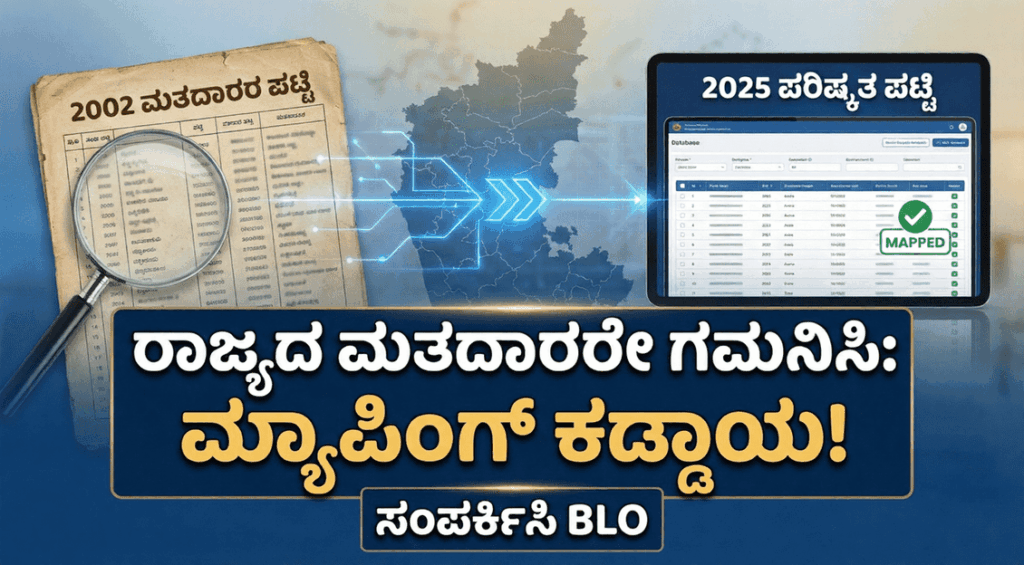 ಮುಖ್ಯಾಂಶಗಳು 2002ರ ಮತದಾರರ ಪಟ್ಟಿಯನ್ನು ಹೊಸ ಪಟ್ಟಿಗೆ ಸೇರಿಸುವುದು ಕಡ್ಡಾಯ. ಸ್ಥಳಾಂತರವಾದವರು ಮತ್ತು ವಿವಾಹಿತ ಮಹಿಳೆಯರು ತಕ್ಷಣ ಮ್ಯಾಪಿಂಗ್ ಮಾಡಿಸಿಕೊಳ್ಳಿ. ಮಾಹಿತಿಗಾಗಿ ನಿಮ್ಮ ಏರಿಯಾದ ಬಿ.ಎಲ್.ಓ (BLO) ಅವರನ್ನು ಸಂಪರ್ಕಿಸಿ. ಬೆಂಗಳೂರು: ಭಾರತ ಚುನಾವಣಾ ಆಯೋಗವು ಮತದಾನ ಪ್ರಕ್ರಿಯೆಯಲ್ಲಿ ಪಾರದರ್ಶಕತೆ ತರಲು ಮಹತ್ವದ ಹೆಜ್ಜೆ ಇಟ್ಟಿದೆ. 2002ರ ಮತದಾರರ ಪಟ್ಟಿಯನ್ನು ಪ್ರಸ್ತುತ 2025ರ ಪರಿಷ್ಕೃತ ಮತದಾರರ ಪಟ್ಟಿಗೆ ಮ್ಯಾಪಿಂಗ್ ಮಾಡುವ ಕಾರ್ಯವು ರಾಜ್ಯಾದ್ಯಂತ ಭರದಿಂದ ಸಾಗುತ್ತಿದೆ. ನಿಮ್ಮ ಮತದಾನದ ಹಕ್ಕನ್ನು ಉಳಿಸಿಕೊಳ್ಳಲು ಮತ್ತು ಪಟ್ಟಿಯಲ್ಲಿ ನಿಮ್ಮ ಹೆಸರು … Continue reading 2002ರ ನಂತರದ ವೋಟರ್ ಐಡಿ ‘ಮ್ಯಾಪಿಂಗ್’ ಮಾಡಿಸಿಕೊಳ್ಳದಿದ್ದರೆ ಮತದಾನದ ಹಕ್ಕು ಇಲ್ಲಾ ಇದು ಕಡ್ಡಾಯ.!