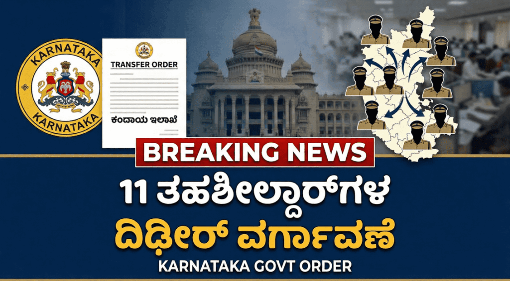 ಮುಖ್ಯಾಂಶಗಳು (Highlights) • ರಾಜ್ಯದ 11 ಮಂದಿ ತಹಶೀಲ್ದಾರ್ಗಳ ದಿಢೀರ್ ವರ್ಗಾವಣೆ ಆದೇಶ. • ಆಡಳಿತಾತ್ಮಕ ಹಿತದೃಷ್ಟಿಯಿಂದ ತಕ್ಷಣದಿಂದಲೇ ಜಾರಿಗೆ ಬರುವಂತೆ ಸೂಚನೆ. • ಬೆಂಗಳೂರು, ಮೈಸೂರು ಸೇರಿದಂತೆ ಪ್ರಮುಖ ಜಿಲ್ಲೆಗಳ ಅಧಿಕಾರಿಗಳು ಬದಲಾವಣೆ. ಬೆಂಗಳೂರು: ರಾಜ್ಯ ಸರ್ಕಾರವು ಕಂದಾಯ ಇಲಾಖೆಯಲ್ಲಿ ಆಡಳಿತಾತ್ಮಕ ಸುಧಾರಣೆ ಮತ್ತು ಸಾರ್ವಜನಿಕ ಹಿತದೃಷ್ಟಿಯಿಂದ ಮಹತ್ವದ ನಿರ್ಧಾರ ಕೈಗೊಂಡಿದೆ. ಕರ್ನಾಟಕ ಸರ್ಕಾರದ ಕಂದಾಯ ಇಲಾಖೆಯ ತಹಶೀಲ್ದಾರ್ ಶ್ರೇಣಿಯ 11 ಮಂದಿ ಅಧಿಕಾರಿಗಳನ್ನು ತಕ್ಷಣದಿಂದ ಜಾರಿಗೆ ಬರುವಂತೆ ವಿವಿಧ ಸ್ಥಳಗಳಿಗೆ ವರ್ಗಾವಣೆ ಮಾಡಿ ಅಧಿಕೃತ … Continue reading BREAKING: ರಾಜ್ಯ ಕಂದಾಯ ಇಲಾಖೆಯಲ್ಲಿ ಭಾರಿ ಬದಲಾವಣೆ; 11 ಮಂದಿ ತಹಶೀಲ್ದಾರ್ಗಳ ವರ್ಗಾವಣೆ ಮಾಡಿ ಸರ್ಕಾರ ಆದೇಶ