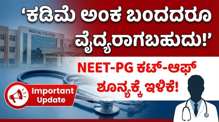 NEET-PG ಹೊಸ ಕಟ್-ಆಫ್ ಮುಖ್ಯಾಂಶಗಳು ಐತಿಹಾಸಿಕ ಇಳಿಕೆ: ಖಾಲಿ ಇರುವ ಎಂ.ಡಿ/ಎಂ.ಎಸ್ ಸೀಟುಗಳನ್ನು ಭರ್ತಿ ಮಾಡಲು ಕಟ್-ಆಫ್ ಅಂಕಗಳನ್ನು ಶೂನ್ಯಕ್ಕೆ (Zero) ಇಳಿಸಲಾಗಿದೆ. ಮೀಸಲಾತಿ ವರ್ಗ: SC, ST ಮತ್ತು OBC ಅಭ್ಯರ್ಥಿಗಳಿಗೆ ಕಟ್-ಆಫ್ ಅಂಕ -40 ರವರೆಗೆ ಕುಸಿದಿದ್ದು, ಪರೀಕ್ಷೆ ಬರೆದ ಬಹುತೇಕ ಎಲ್ಲರೂ ಈಗ ಕೌನ್ಸೆಲಿಂಗ್ಗೆ ಅರ್ಹರು. ಉದ್ದೇಶ: ವೈದ್ಯಕೀಯ ಕಾಲೇಜುಗಳಲ್ಲಿ ಬೋಧಕರ ಕೊರತೆ ನೀಗಿಸಲು ಮತ್ತು ಖಾಲಿ ಉಳಿಯುವ ಸೀಟುಗಳನ್ನು ಭರ್ತಿ ಮಾಡಲು ಈ ನಿರ್ಧಾರ ಕೈಗೊಳ್ಳಲಾಗಿದೆ. ದೇಶದ ವೈದ್ಯಕೀಯ ಲೋಕದಲ್ಲಿ ಈಗ ಒಂದು ದೊಡ್ಡ … Continue reading ಶಾಕಿಂಗ್ ನ್ಯೂಸ್: ಶೂನ್ಯಕ್ಕೆ ಇಳಿದ NEET-PG ಕಟ್-ಆಫ್! ವೈದ್ಯಕೀಯ ಶಿಕ್ಷಣದ ಗುಣಮಟ್ಟದ ಬಗ್ಗೆ ಶುರುವಾಯ್ತು ಭಾರಿ ಚರ್ಚೆ.