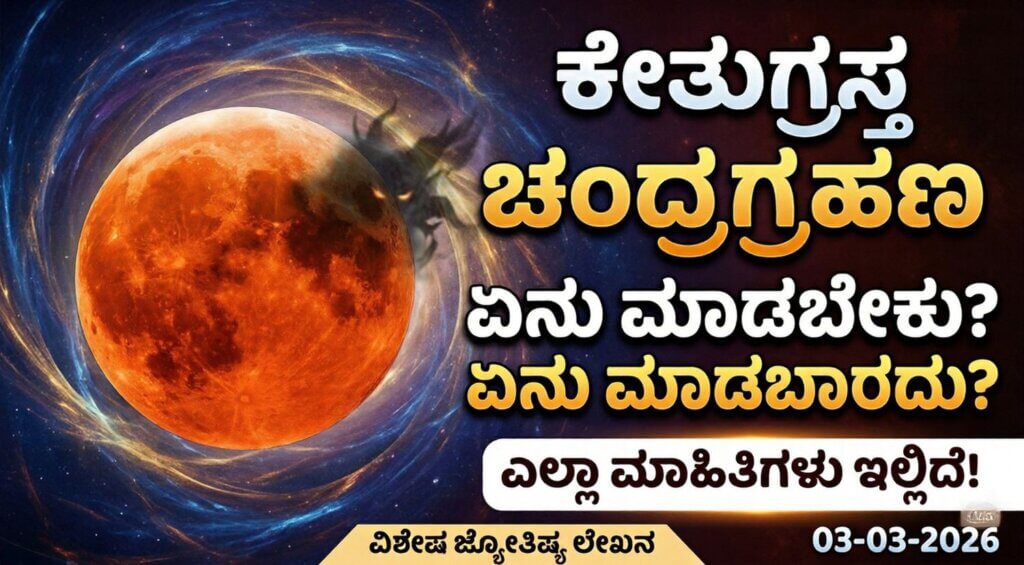 📌 ಪ್ರಮುಖ ಮುಖ್ಯಾಂಶಗಳು 🟠 ಮಾರ್ಚ್ 3, ಮಂಗಳವಾರ ಹೋಳಿ ಹಬ್ಬದಂದೇ ಅಪರೂಪದ ಚಂದ್ರಗ್ರಹಣ. 🟠 ನಾಳೆ ಸಂಜೆ 6:26 ರಿಂದ 6:46 ರವರೆಗೆ ಗ್ರಹಣ ಸಂಭವಿಸಲಿದೆ. 🟠 ಬೆಳಗ್ಗೆ 9:39 ರಿಂದ ಸೂತಕ ಕಾಲ; ದೇವಸ್ಥಾನಗಳ ಬಾಗಿಲು ಬಂದ್. ಆಕಾಶದಲ್ಲಿ ನಾಳೆ ಅಂದರೆ March 3, 2026 ರಂದು ಒಂದು ಅಪರೂಪದ ಖಗೋಳ ವಿದ್ಯಮಾನ ಘಟಿಸಲಿದೆ. ವಿಶೇಷವೆಂದರೆ ಬಣ್ಣಗಳ ಹಬ್ಬ ಹೋಳಿಯ ದಿನವೇ ಈ ‘ಕೇತುಗ್ರಸ್ತ ಚಂದ್ರಗ್ರಹಣ’ (Kethugrasta Chandra Grahana) ಸಂಭವಿಸುತ್ತಿರುವುದು ಜ್ಯೋತಿಷ್ಯ ಶಾಸ್ತ್ರದ … Continue reading ನಾಳೆ ವಿಶ್ವದಾದ್ಯಂತ ‘ಕೇತುಗ್ರಸ್ತ ಚಂದ್ರಗ್ರಹಣ’; ಈ ಸಮಯದಲ್ಲಿ ಏನು ಮಾಡಬೇಕು? ಏನು ಮಾಡಬಾರದು? ಇಲ್ಲಿದೆ ಕಂಪ್ಲೀಟ್ ಗೈಡ್!